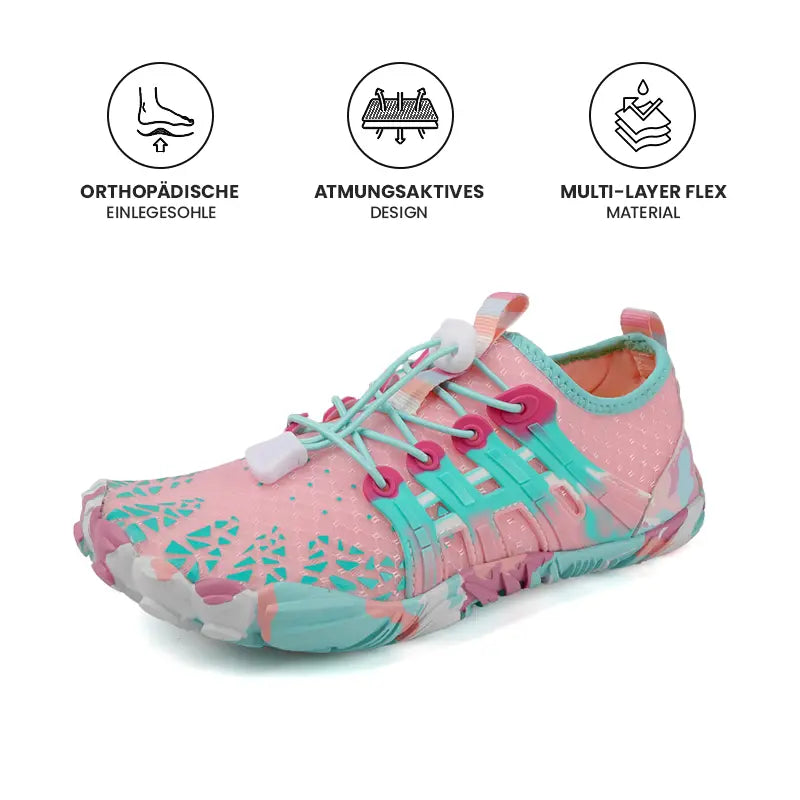 Unsere Barfussschuhe haben eine breite Zehenbox für maximale Flexibilität bei jedem Schritt. Die Innensohle bietet höchste Stossdämpfung und reduziert das Risiko von Fussermüdung, Fersensporn, Knöchel-, Hüft- und Knieschmerzen. Das atmungsaktive Material, lässt deine Füsse atmen und übermittelt ein Gefühl der grenzenlosen Freiheit.