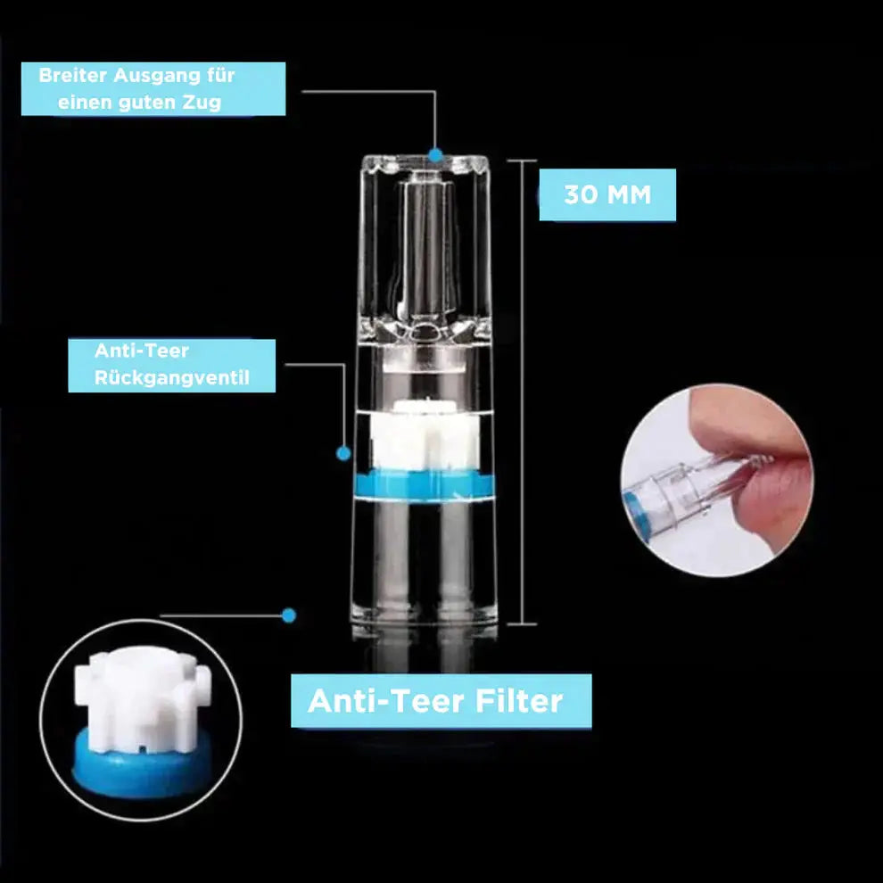 Während der Filter schädliche Stoffe und Teer entfernt, lässt er Nikotin passieren. Dadurch wird das Rauchen deutlich weniger schädlich und du bekommst nie wieder lästigen Raucherhusten!