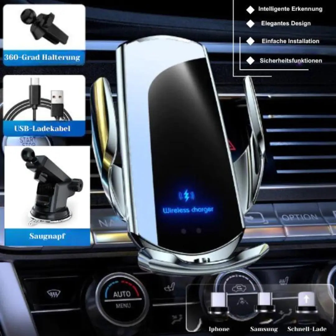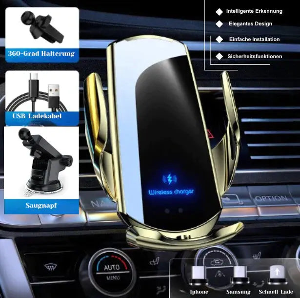 Unser AutoHold vereint modernste Technologie mit praktischer Funktionalität. Dieses Produkt ist nicht nur eine Handyhalterung, sondern auch ein stylisches Wireless Ladegerät. Die Ladestation ermöglicht dir, schnelles kabelloses Aufladen deines Smartphones, während du unterwegs bist.